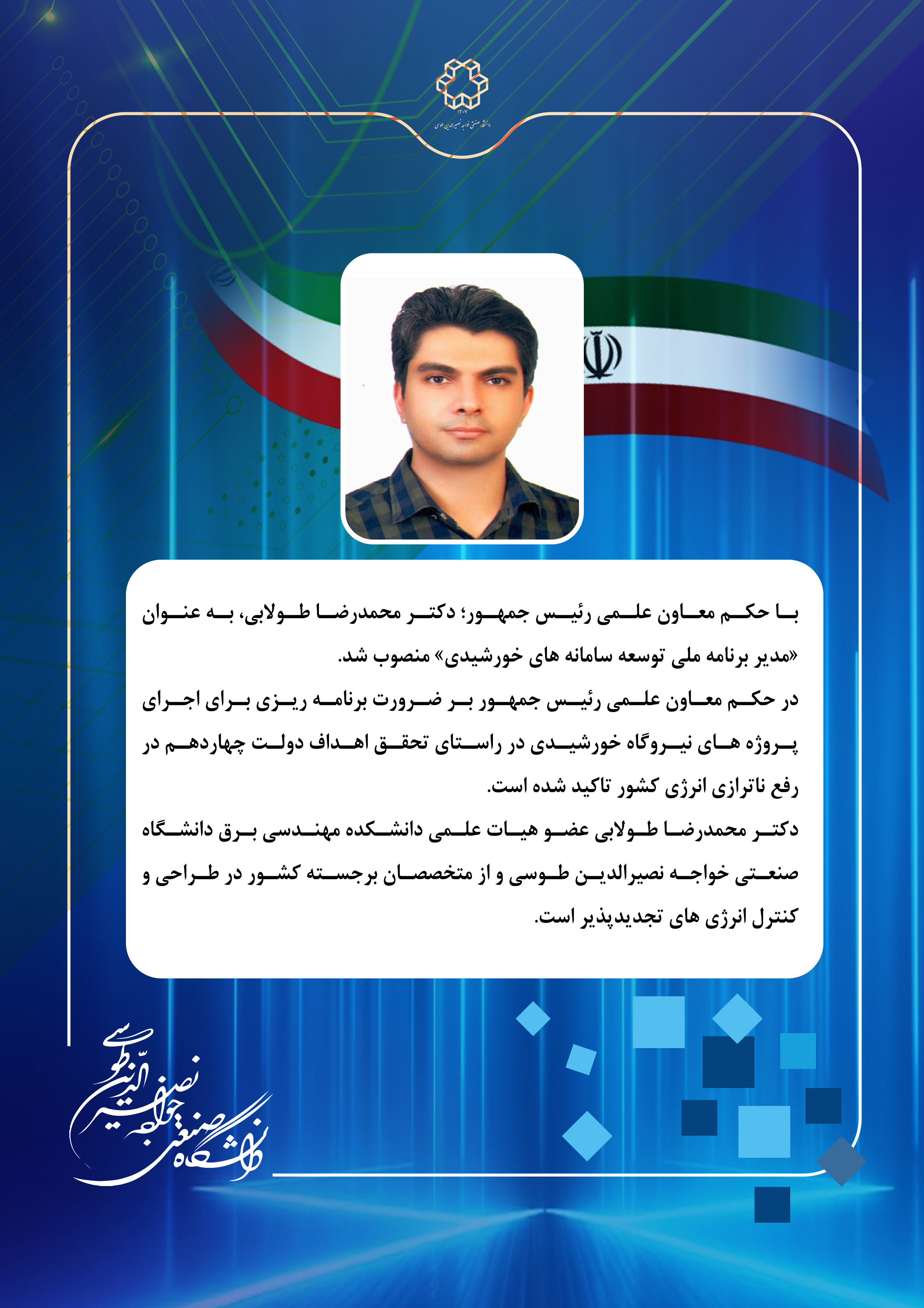 دکتر محمدرضا طولابی عضو هیات علمی دانشکده مهندسی برق دانشگاه صنعتی خواجه نصیرالدین طوسی و از متخصصان برجسته کشور در طراحی و کنترل انرژی های تجدیدپذیر است.