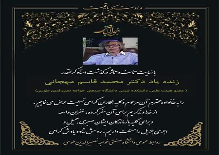 یکی دیگر از مفاخر علمی و شخصیت‌های درخشان دانشگاه چشم از جهان فروبست و خیل بزرگ دوست‌داران علم و فضیلت را به سوگ نشاند. استاد دلسوزِ دردمندِ عاشق، دانشمندِ گرانسنگ، جناب آقای دکتر محمدقاسم مه جانی پس از عمری تلاش در راه اعتلای دانش و دانشگاه با کارنامه‌ای مشحون از خدمات ارزنده به دانشگاه و جامعه‌ی علمی کشور روز یکشنبه نوزدهم مرداد هزار و چهارصد و چهار خورشیدی آسمانی شد و علاوه بر آثار ستودنی علمی، اخلاقی و انسانی، این پیام جاوید را پشتِ سرِ خود بر جای گذاشت و دوباره به اثبات رساند که هرگز نمیرد آنکه دلش زنده شد به عشق. دوامِ خاطرات نیکوی این استاد فاضل و وارسته در یادها و دل‌ها ثبت شده و خواهد ماند.