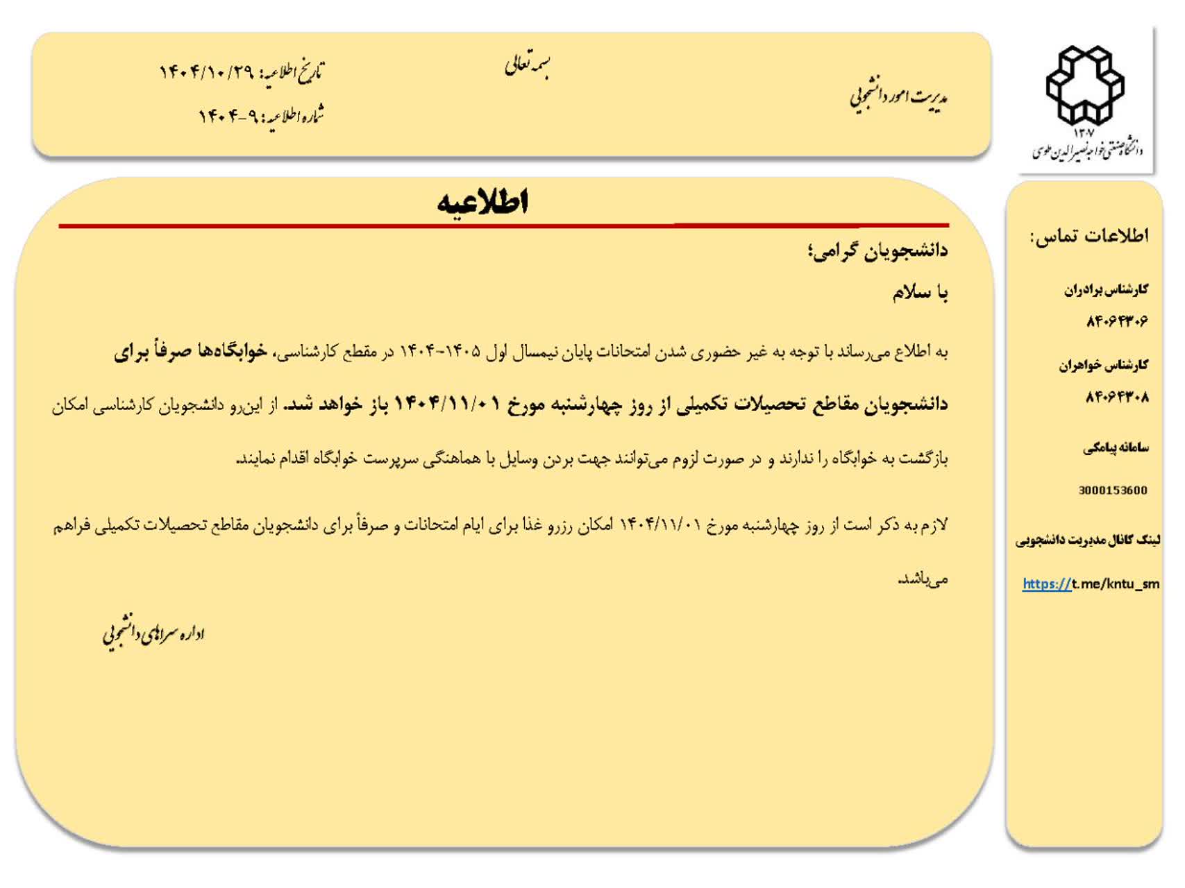 اطلاعیه مدیریت امور دانشجویی