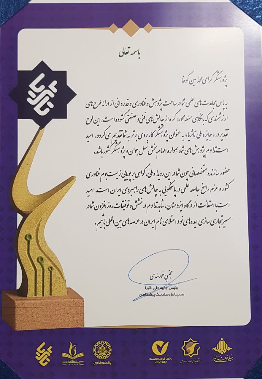آقای کوخا با طرح "مخزن کامپوزیتی ذخیره مایعات اطفای حریق با ساختار لانه زنبوری برای خودروهای آتش نشانی" در این رویداد ملی شرکت نمود و عنوان پژوهشگر کاربردی برتر را از آن خود نمود.